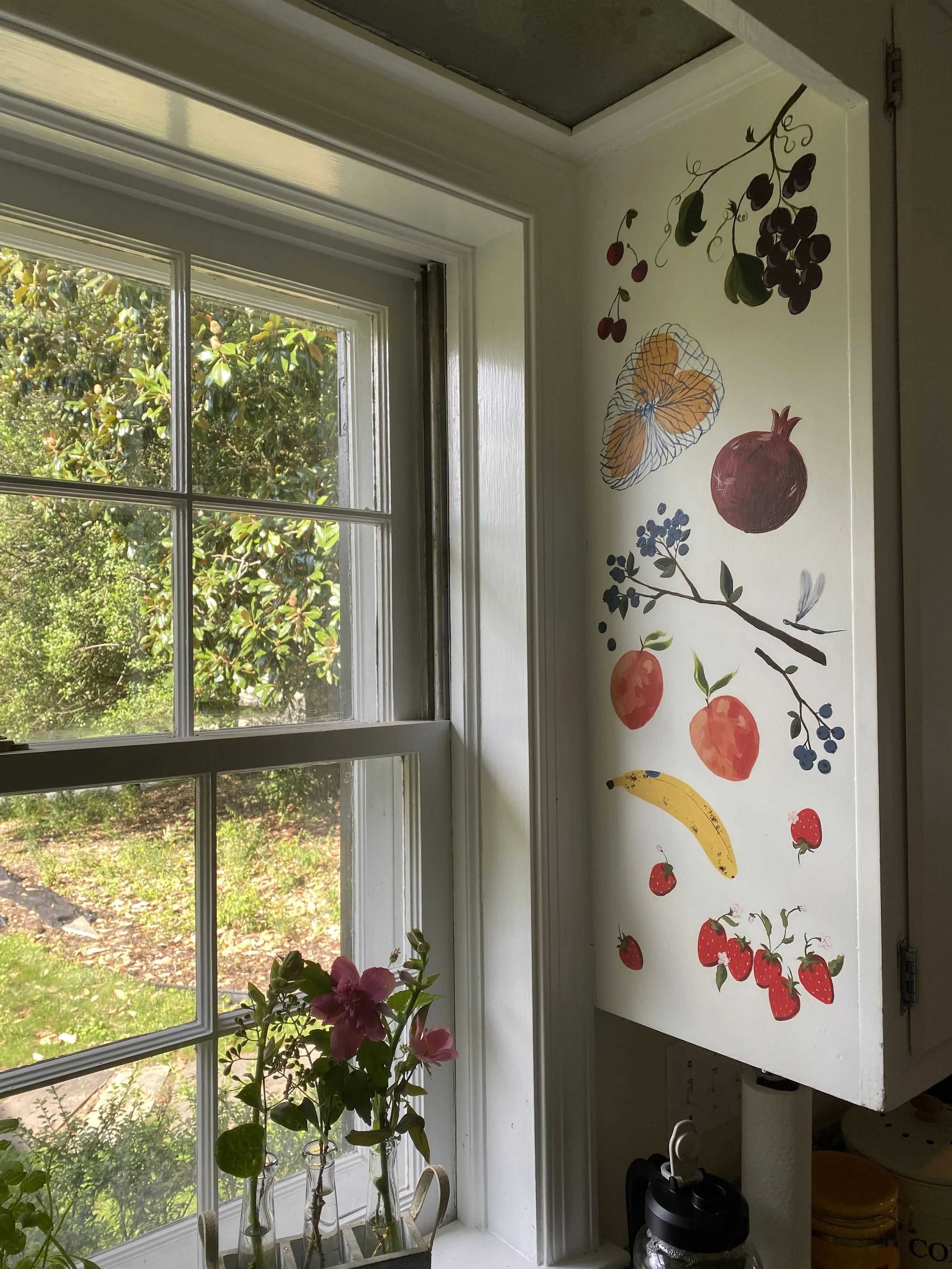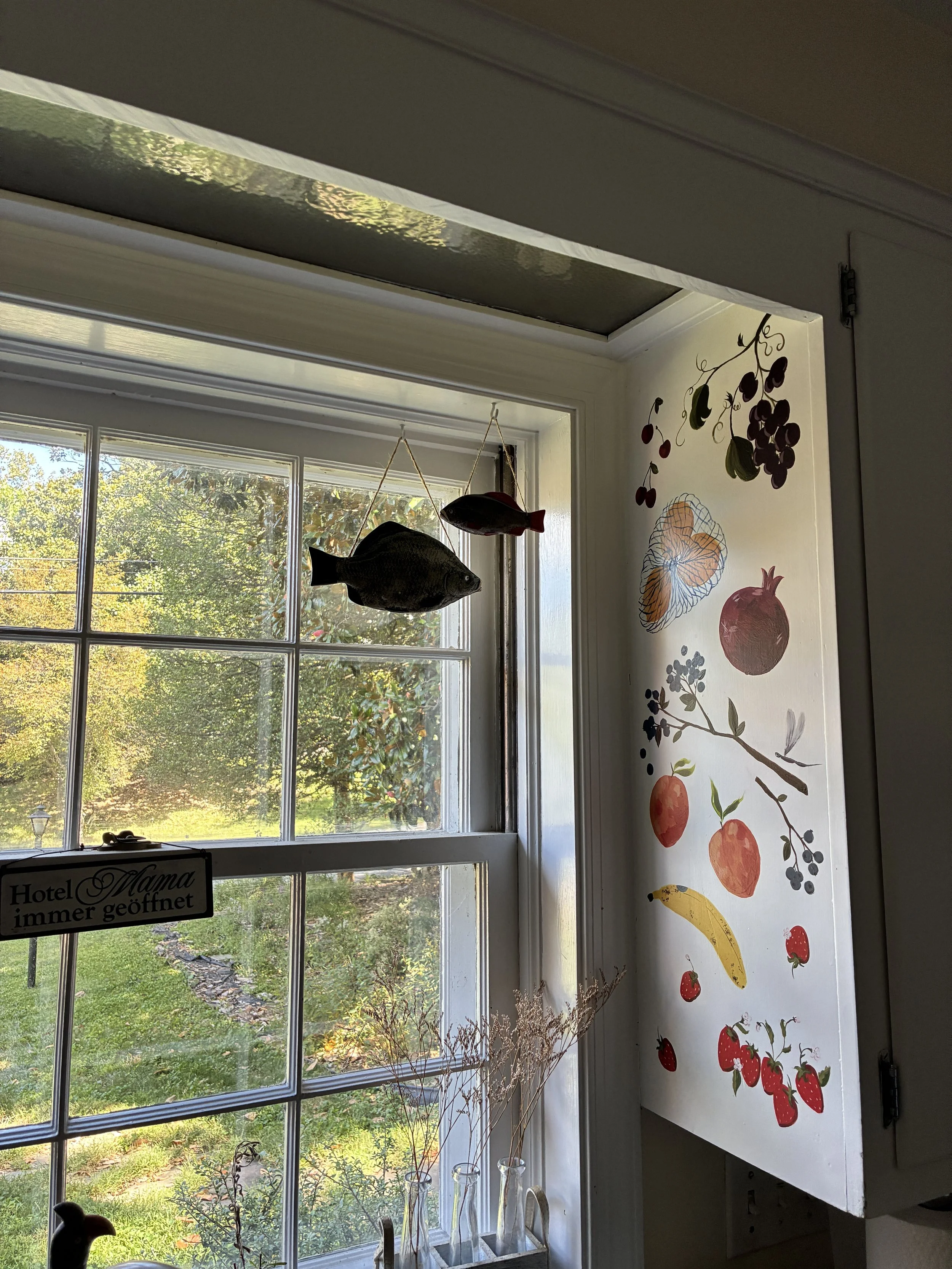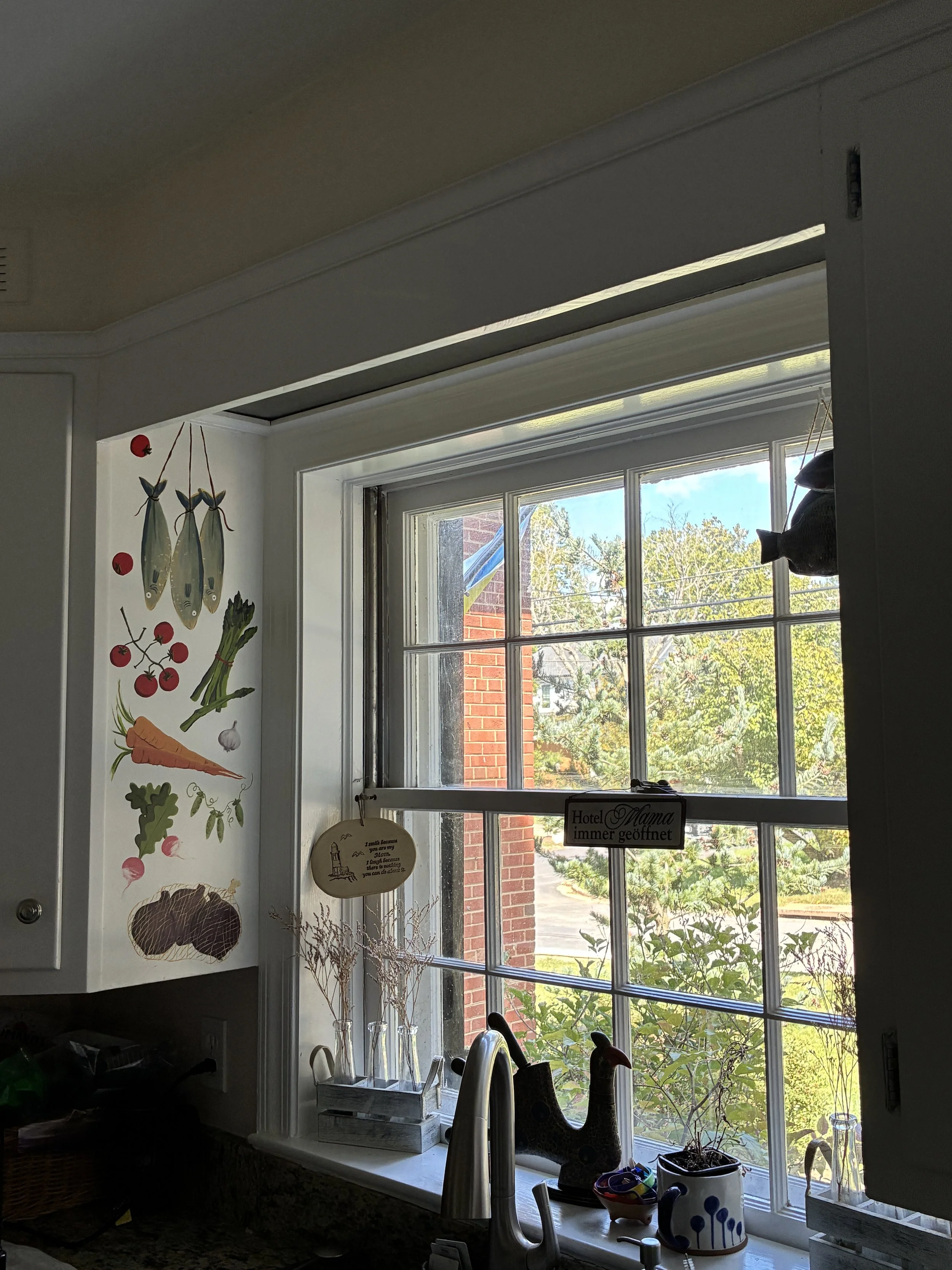 Free hand painted twin murals flanking windows over kitchen sink to brighten up the space while tackling dishes.