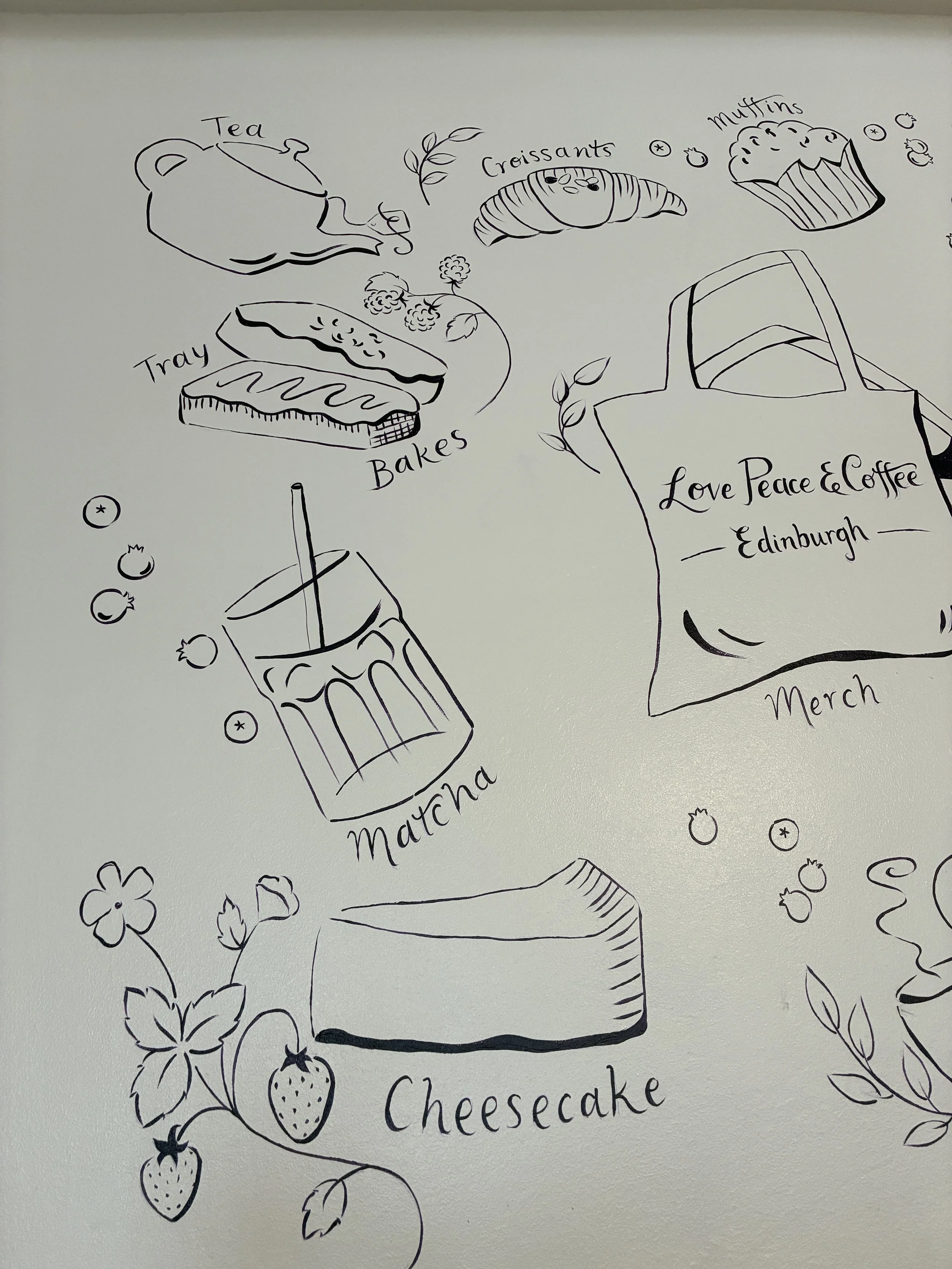 Hand painted mural with some menu items for Edinburgh based cafe Love Peace & Coffee.